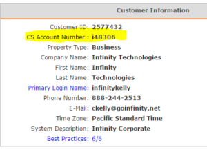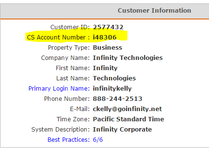 Once this is completed you will go back to Alarm.com and click on "Customer Info". On this page, you will find the account number. This number is what connects the customer's system to the central station. It is found under "CS Account Number":