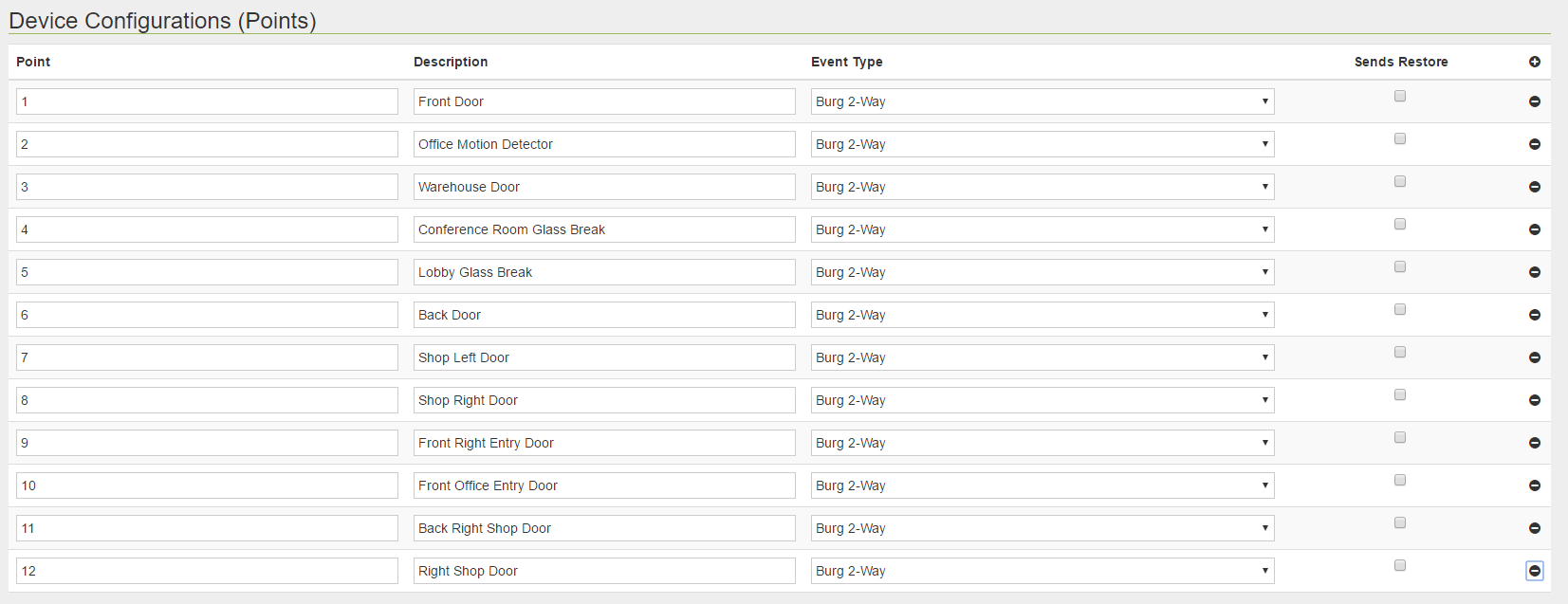 From here you will enter the "Device Configurations (Points)" into Avantguard. Select the + button for the amount of devices listed in the equipment list on Alarm.com. Each "point" and "description" in Avantguard is the same as "Device ID" and "Device Name" in Alarm.com respectively. For "Event Type" always select "Burg 2-way" like below: