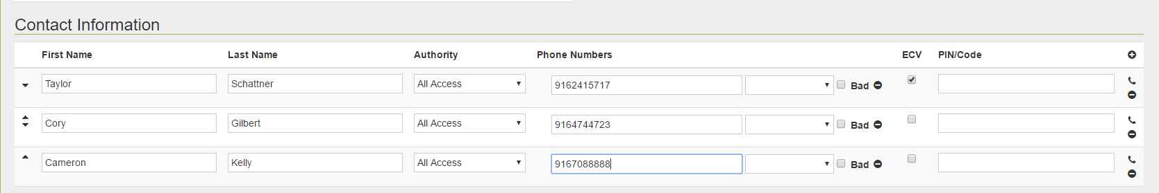 On the contract, you will find the emergency contact list. You will enter the information in the following fields (make sure you give them "All Access" and select the first contact as the ECV (enhanced contact verification)) to add a phone number select the phone icon: