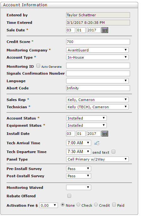 Next, you will enter the account information. Put in the sale date, credit score (700 will be your default), the monitoring company will always be Avantguard, account will always be InHouse, leave the account number blank until you log into alarm.com to put the account online with Avantguard, skip to Abort Code and enter in the word selected by the customer (extremely important that this is correct). After that select the sales reps name, techs name, then account and equipment status as installed, enter the date and time, always select Cell Primary/2way from panel type and hit save.