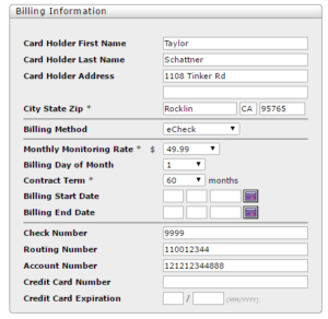 Then you will enter the billing information for the monthly monitoring for the customer. In billing method, you will select either eCheck (for autopay from a checking account) or Credit Card (for debiting a credit card). Select the amount of the monthly monitoring rate that the customer has selected, the date of the month they want their payment to be taken out (if no date is specified select the install date) contract term (60) and enter the billing information. (TIP: since there are only 28 days in Feb. we can only bill people on the 1st-28th of the month so if they are installed on the 30th put their bill date on the 1st):