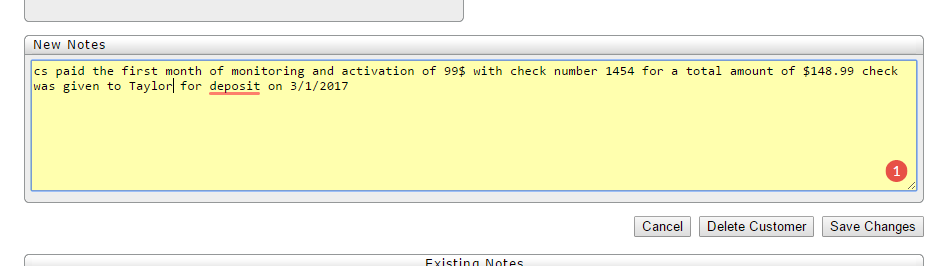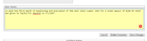 Next, you will set up their billing. First, you will want to charge them the amount on the contract for set up. This will be their first month and any additional fees associated with their account. If the customer has written a check for the first payment make sure it is noted in the notes. You will click on "edit customer" scroll down the notes section and enter in the notes like below with as much information as possible: