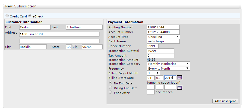 After a customer has been charged the initial payment you will need to set up a subscription for the system to bill them every month. To do this you will select "Billing Subscriptions". You will then enter the appropriate payment information. Make sure you enter the correct monthly monitoring amount, then the transaction category, and most important the frequency (every 1 month), bill start date (this will be the following month on the billing date of the month entered above), and "No End Date" like below:
