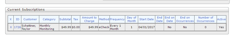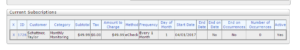 After all information is entered into the system you will select "Add Subscription". This will set up automatic billing for the customer every month for their monthly monitoring. Make sure that subscription shows in the "Current Subscriptions" as it does below to make sure the customers billing is complete: