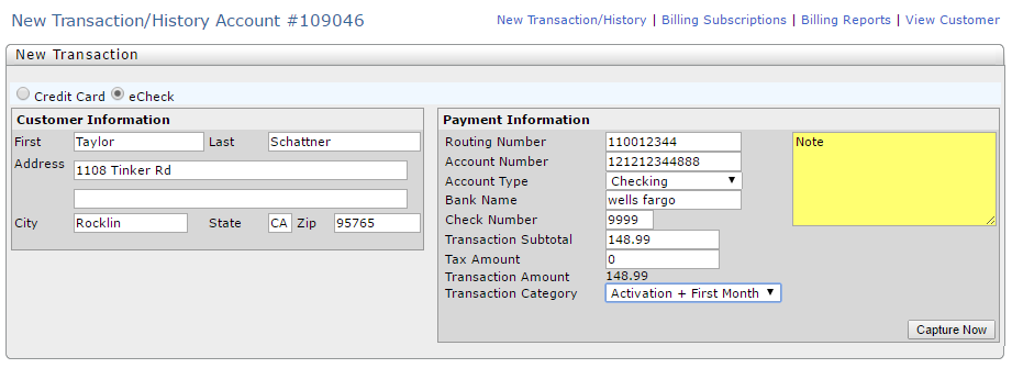 To bill customer select "Billing" then select the appropriate account type, bank name (if unknown google the routing number to get the bank name), enter transaction subtotal, tax amount (if applicable, if not enter 0), and the transaction category: