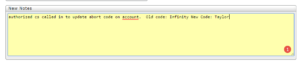 You will click on Edit Customer and enter a note in the notes section indicating that the customer has called in with correct authorization to update the abort code.  Put the old code in the notes section and update the abort code to the new code: